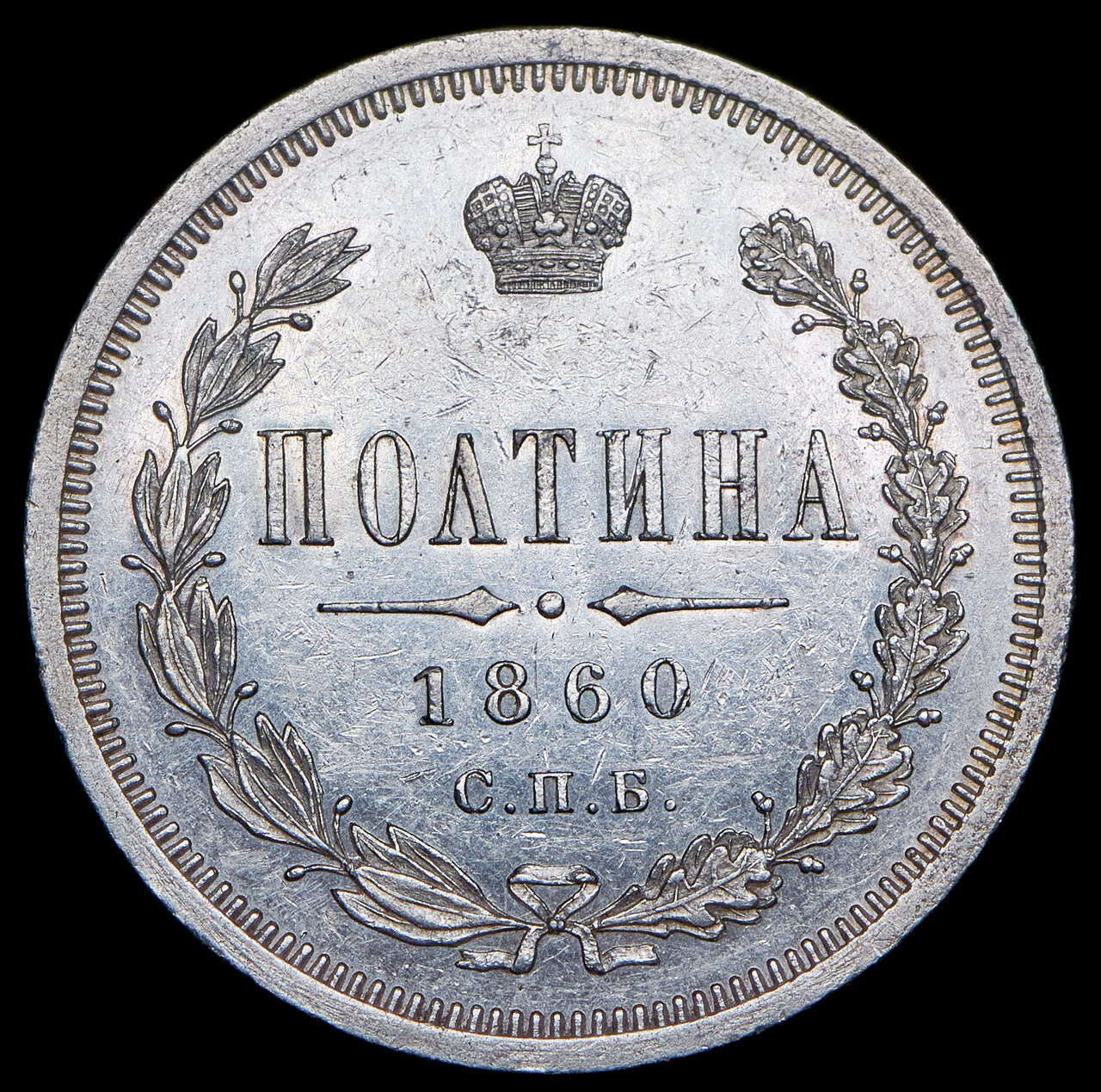 В центре указан номинал «ПОЛТИНА». Над номиналом – Корона Российской империи. Под номиналом расположен декоративный разделитель в виде двух разнонаправленных фигурных линий и небольшой выпуклой точки между ними. Под разделителем — дата выпуска монеты «1860». Под цифрой даты — обозначение монетного двора «С.П.Б.». Вдоль канта, не доходя до короны, изображен венок из лавровой и дубовой ветви, которые в нижней части перевязаны лентой на узел бантом. По окружности канта имеются рельефные элементы, выполненные в виде зубцов.