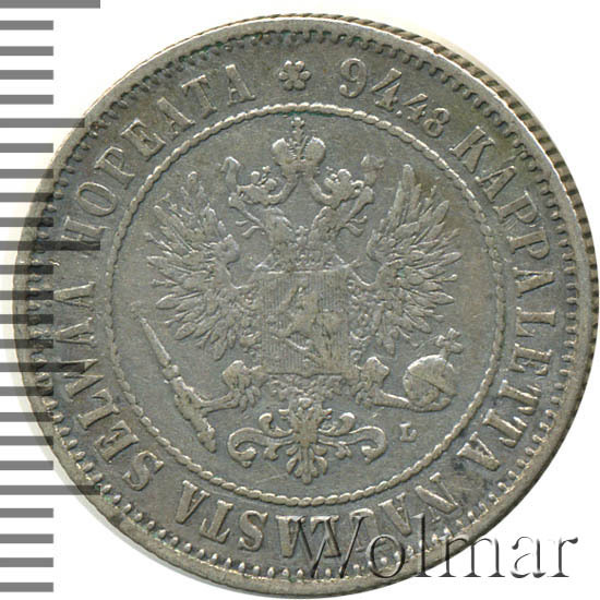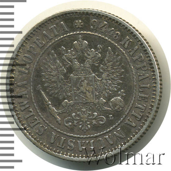 В центре изображён полный Герб Великого княжества Финляндского - двуглавый орёл, головы которого увенчаны двумя коронами, третья, большая корона над ними. Все они соединены орденской лентой ордена Св. Апостола Андрея Первозванного. На груди орла расположен щит с титульным гербом Великого князя Финляндского, увенчанный княжеской короной. Вокруг щита орденская цепь с орденом Св. Апостола Андрея Первозванного. В правой лапе орла – скипетр, в левой – держава. Под левой лапой знак директора Гельсингфосского монетного двора - литера «L», Johan Conrad Lihr (Йохан Конрад Лир). Вокруг центрального изображения - витой ободок. За ободком круговая надпись: «94.48 KAPPALETTA NAULASTA SELWÄÄ HOPEATA», сверху разделённая цветочной розеткой. По окружности канта имеются рельефные элементы, выполненные в виде зубцов.