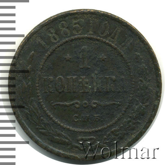 В центре указан номинал «1», ограниченный с обеих сторон звездочками. Под цифрой номинала слово — "КОПЕЙКА". Ниже, расположен декоративный разделитель в виде двух изогнутых линий и небольшой окружности между ними. Под линиями обозначение монетного двора «С.П.Б.». Центральная часть отделена от остального изображения, окружностью в виде точек. В верхней части по кругу углубленная надпись: "1885 ГОДА". Ниже этой надписи, вдоль канта, изображен венок из лавровой и дубовой ветви, которые в нижней части перевязаны лентой на узел бантом.