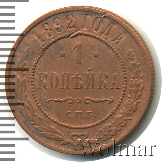 В центре указан номинал «1», ограниченный с обеих сторон звездочками. Под цифрой номинала слово — "КОПЕЙКА". Ниже, расположен декоративный разделитель в виде двух изогнутых линий и небольшой окружности между ними. Под линиями обозначение монетного двора «С.П.Б.». Центральная часть отделена от остального изображения, окружностью в виде точек. В верхней части по кругу углубленная надпись: "1892 ГОДА". Ниже этой надписи, вдоль канта, изображен венок из лавровой и дубовой ветви, которые в нижней части перевязаны лентой на узел бантом.