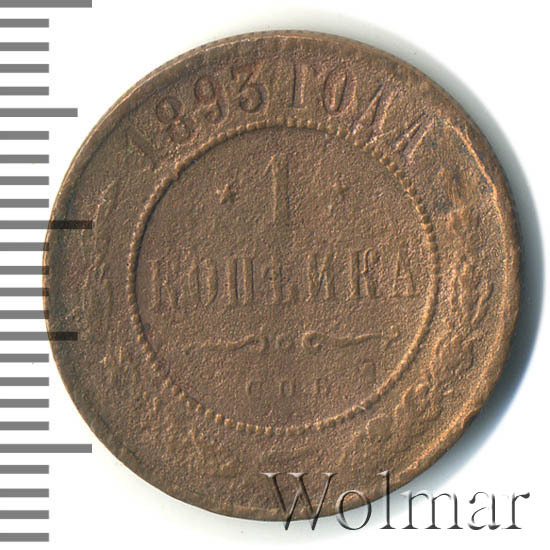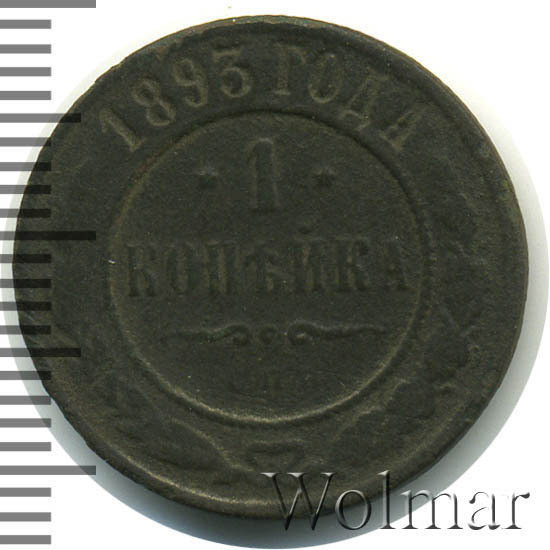 В центре указан номинал «1», ограниченный с обеих сторон звездочками. Под цифрой номинала слово — "КОПЕЙКА". Ниже, расположен декоративный разделитель в виде двух изогнутых линий и небольшой окружности между ними. Под линиями обозначение монетного двора «С.П.Б.». Центральная часть отделена от остального изображения, окружностью в виде точек. В верхней части по кругу углубленная надпись: "1893 ГОДА". Ниже этой надписи, вдоль канта, изображен венок из лавровой и дубовой ветви, которые в нижней части перевязаны лентой на узел бантом.