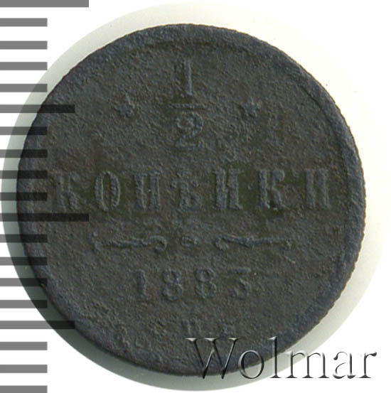 В центре указан номинал «1/2», ограниченный с обеих сторон звездочками. Под цифрой номинала слово — "КОПЕЙКИ". Ниже, расположен декоративный разделитель в виде двух изогнутых линий и небольшой окружности между ними. Под линиями год выпуска монеты "1883" и под ним обозначение монетного двора «С.П.Б.».
