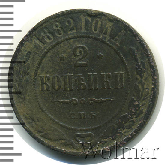 В центре указан номинал «2», ограниченный с обеих сторон звездочками. Под цифрой номинала слово — "КОПЕЙКИ". Ниже, расположен декоративный разделитель в виде двух изогнутых линий и небольшой окружности между ними. Под линиями обозначение монетного двора «С.П.Б.». Центральная часть отделена от остального изображения, окружностью в виде точек. В верхней части по кругу углубленная надпись: "1882 ГОДА". Ниже этой надписи, вдоль канта, изображен венок из лавровой и дубовой ветви, которые в нижней части перевязаны лентой на узел бантом.