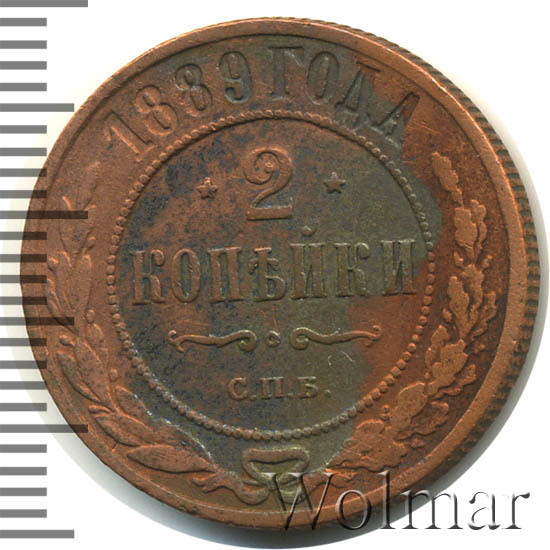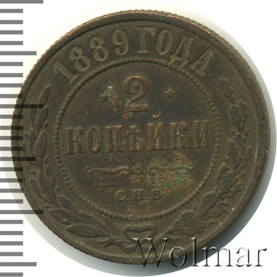 В центре указан номинал «2», ограниченный с обеих сторон звездочками. Под цифрой номинала слово — "КОПЕЙКИ". Ниже, расположен декоративный разделитель в виде двух изогнутых линий и небольшой окружности между ними. Под линиями обозначение монетного двора «С.П.Б.». Центральная часть отделена от остального изображения, окружностью в виде точек. В верхней части по кругу углубленная надпись: "1889 ГОДА". Ниже этой надписи, вдоль канта, изображен венок из лавровой и дубовой ветви, которые в нижней части перевязаны лентой на узел бантом.