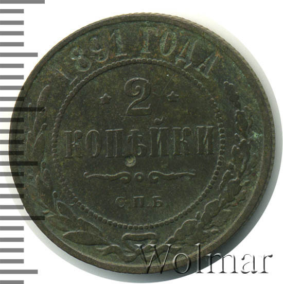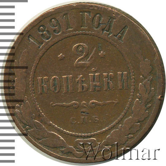 В центре указан номинал «2», ограниченный с обеих сторон звездочками. Под цифрой номинала слово — "КОПЕЙКИ". Ниже, расположен декоративный разделитель в виде двух изогнутых линий и небольшой окружности между ними. Под линиями обозначение монетного двора «С.П.Б.». Центральная часть отделена от остального изображения, окружностью в виде точек. В верхней части по кругу углубленная надпись: "1891 ГОДА". Ниже этой надписи, вдоль канта, изображен венок из лавровой и дубовой ветви, которые в нижней части перевязаны лентой на узел бантом.