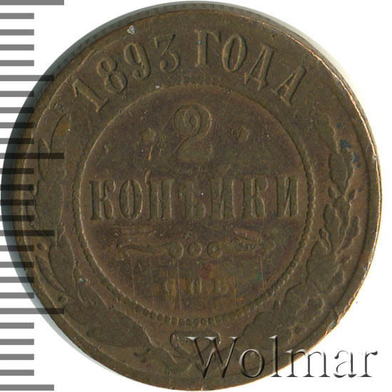 В центре указан номинал «2», ограниченный с обеих сторон звездочками. Под цифрой номинала слово — "КОПЕЙКИ". Ниже, расположен декоративный разделитель в виде двух изогнутых линий и небольшой окружности между ними. Под линиями обозначение монетного двора «С.П.Б.». Центральная часть отделена от остального изображения, окружностью в виде точек. В верхней части по кругу углубленная надпись: "1893 ГОДА". Ниже этой надписи, вдоль канта, изображен венок из лавровой и дубовой ветви, которые в нижней части перевязаны лентой на узел бантом.