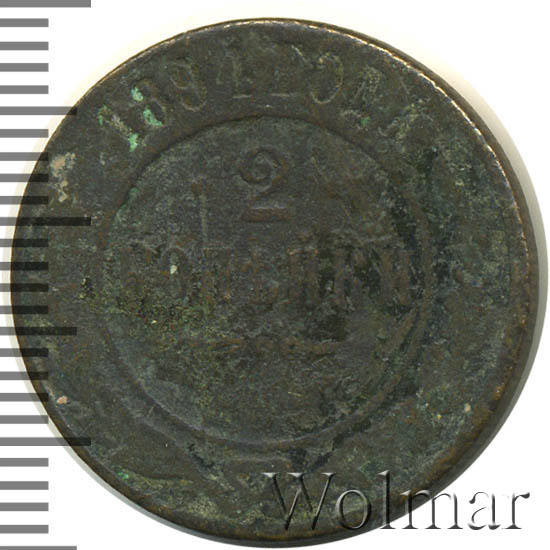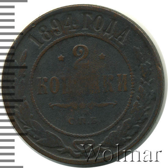 В центре указан номинал «2», ограниченный с обеих сторон звездочками. Под цифрой номинала слово — "КОПЕЙКИ". Ниже, расположен декоративный разделитель в виде двух изогнутых линий и небольшой окружности между ними. Под линиями обозначение монетного двора «С.П.Б.». Центральная часть отделена от остального изображения, окружностью в виде точек. В верхней части по кругу углубленная надпись: "1894 ГОДА". Ниже этой надписи, вдоль канта, изображен венок из лавровой и дубовой ветви, которые в нижней части перевязаны лентой на узел бантом.