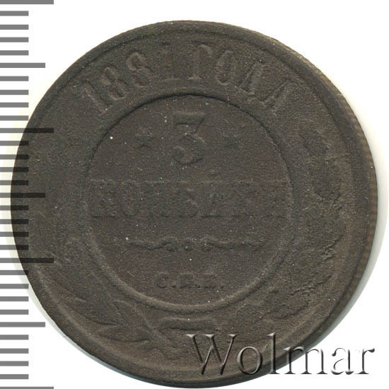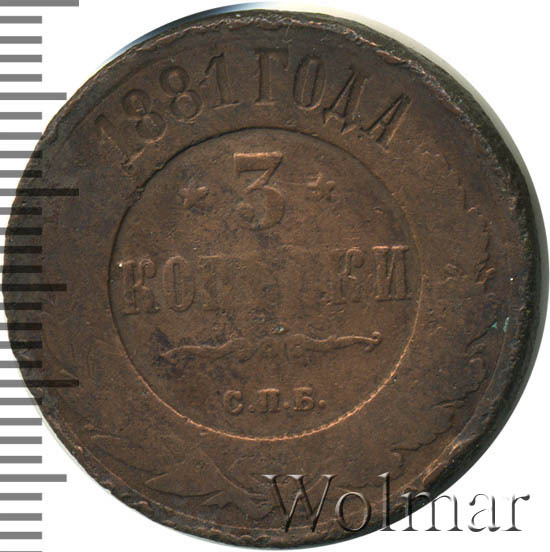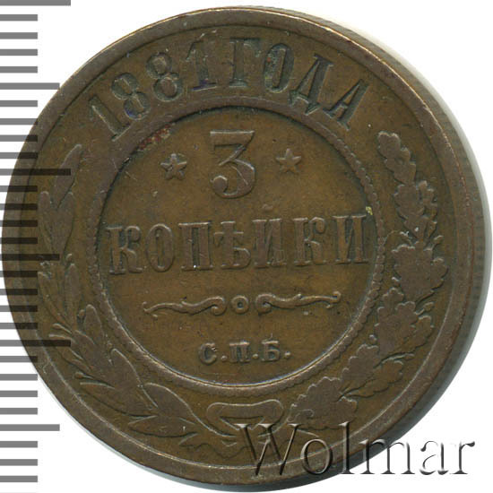 В центре указан номинал - цифра «3», ограниченный с обеих сторон звездочками. Под цифрой номинала слово — "КОПЕЙКИ". Ниже, расположен декоративный разделитель в виде двух изогнутых линий и небольшой окружности между ними. Под линиями обозначение монетного двора «С.П.Б.». Центральная часть отделена от остального изображения, окружностью в виде точек. В верхней части по кругу углубленная надпись: "1881 ГОДА". Ниже этой надписи, вдоль канта, изображен венок из лавровой и дубовой ветви, которые в нижней части перевязаны лентой на узел бантом.