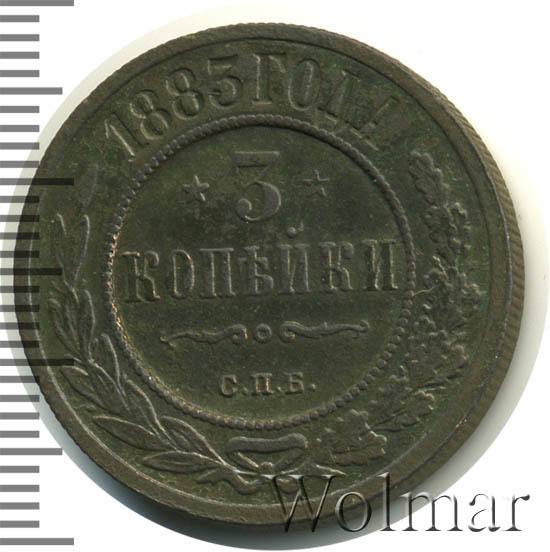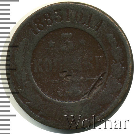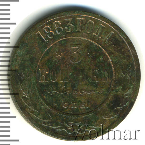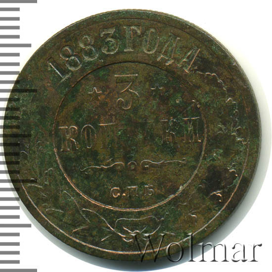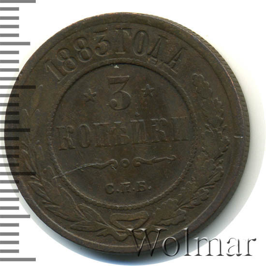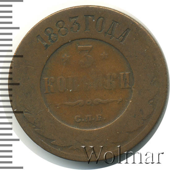 В центре указан номинал «3», ограниченный с обеих сторон звездочками. Под цифрой номинала слово — "КОПЕЙКИ". Ниже, расположен декоративный разделитель в виде двух изогнутых линий и небольшой окружности между ними. Под линиями обозначение монетного двора «С.П.Б.». Центральная часть отделена от остального изображения, окружностью в виде точек. В верхней части по кругу углубленная надпись: "1883 ГОДА". Ниже этой надписи, вдоль канта, изображен венок из лавровой и дубовой ветви, которые в нижней части перевязаны лентой на узел бантом.
