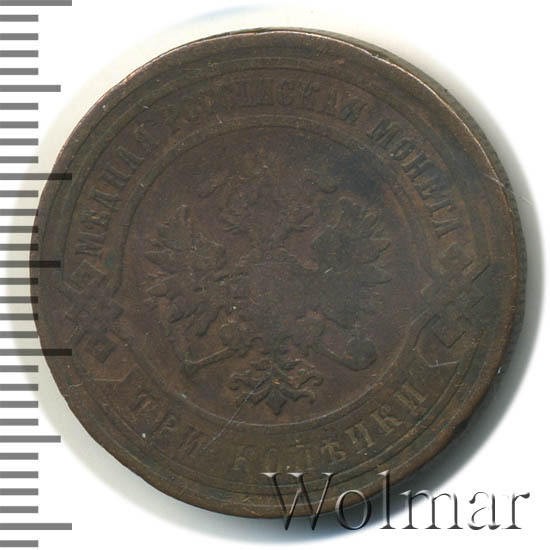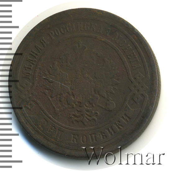 В центре монеты изображен Малый Государственный Герб Российской империи - двуглавый орел, головы которого увенчаны двумя коронами, третья, большая корона над ними. Все они соединены лентой Андрея Первозванного. В правой лапе орла – скипетр, в левой – держава. На его груди расположен Московский герб, в щите изображен Георгий Победоносец с копьем поражающий дракона. Вокруг щита цепь ордена Св. Апостола Андрея Первозванного. На крыльях орла изображены гербы: Царства Казанского, Польского, Херсонеса Таврического, Астраханского, Сибирского, Грузинского и герб соединенных княжеств Киевского, Новгородского и Владимирского — по 4 на каждое крыло. По окружности - две полукруглые плашки, соединенные узорами. На верхней плашке выпуклая надпись: "МЕДНАЯ РОССИЙСКАЯ МОНЕТА". На нижней плашке, изображенной в виде ленты, углубленная надпись: "ТРИ КОПЕЙКИ".