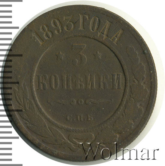 В центре указан номинал «3», ограниченный с обеих сторон звездочками. Под цифрой номинала слово — "КОПЕЙКИ". Ниже, расположен декоративный разделитель в виде двух изогнутых линий и небольшой окружности между ними. Под линиями обозначение монетного двора «С.П.Б.». Центральная часть отделена от остального изображения, окружностью в виде точек. В верхней части по кругу углубленная надпись: "1893 ГОДА". Ниже этой надписи, вдоль канта, изображен венок из лавровой и дубовой ветви, которые в нижней части перевязаны лентой на узел бантом.