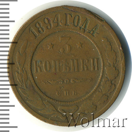 В центре указан номинал «3», ограниченный с обеих сторон звездочками. Под цифрой номинала слово — "КОПЕЙКИ". Ниже, расположен декоративный разделитель в виде двух изогнутых линий и небольшой окружности между ними. Под линиями обозначение монетного двора «С.П.Б.». Центральная часть отделена от остального изображения, окружностью в виде точек. В верхней части по кругу углубленная надпись: "1894 ГОДА". Ниже этой надписи, вдоль канта, изображен венок из лавровой и дубовой ветви, которые в нижней части перевязаны лентой на узел бантом.