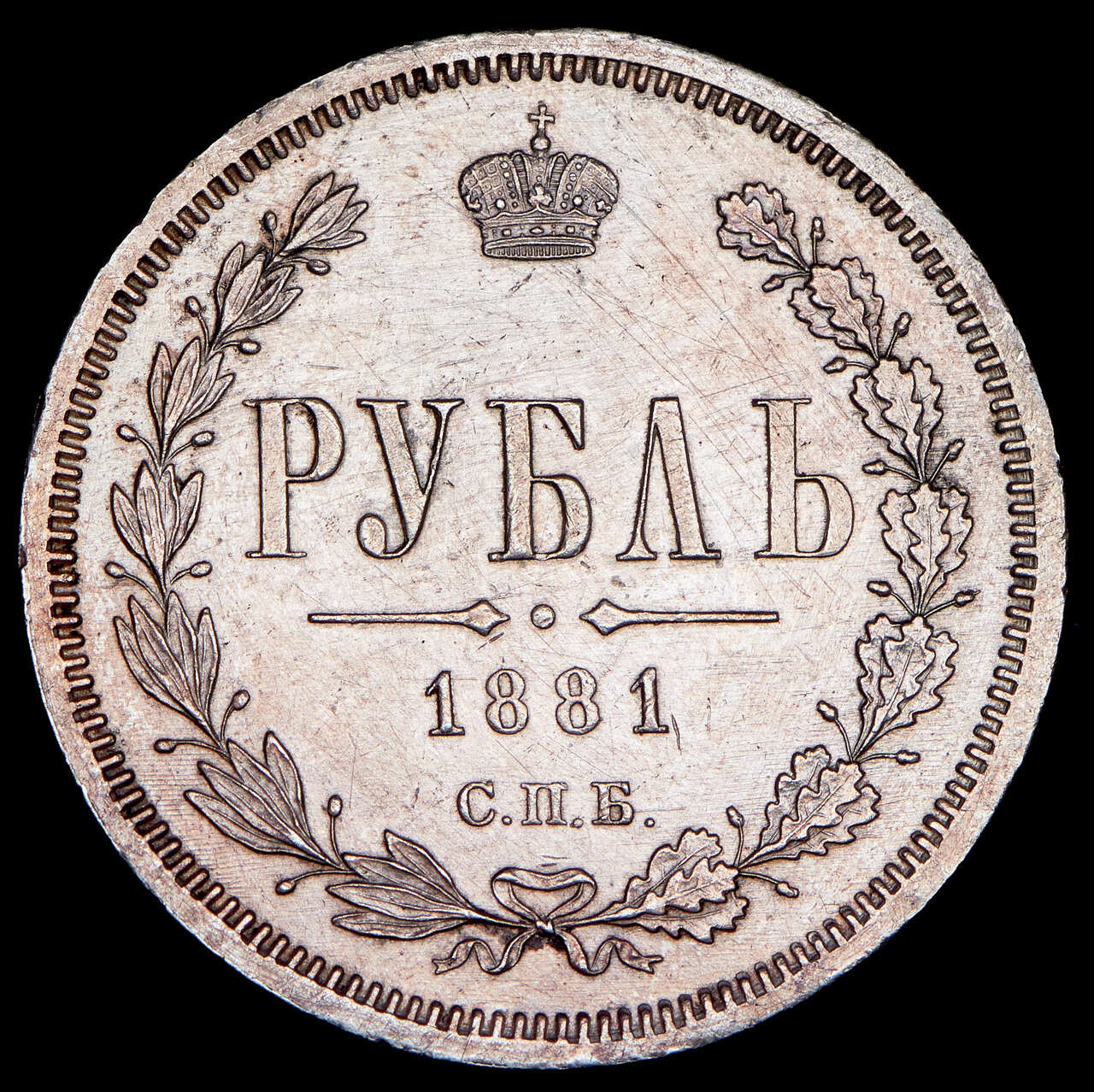 В центре указан номинал «РУБЛЬ». Над номиналом – Корона Российской империи. Под номиналом расположен декоративный разделитель в виде двух разнонаправленных фигурных линий и небольшой выпуклой точки между ними. Под разделителем — дата выпуска монеты «1881». Под цифрой даты — обозначение монетного двора «С.П.Б.». Вдоль канта, не доходя до короны, изображен венок из лавровой и дубовой ветви, которые в нижней части перевязаны лентой на узел бантом. По окружности канта имеются рельефные элементы, выполненные в виде зубцов.