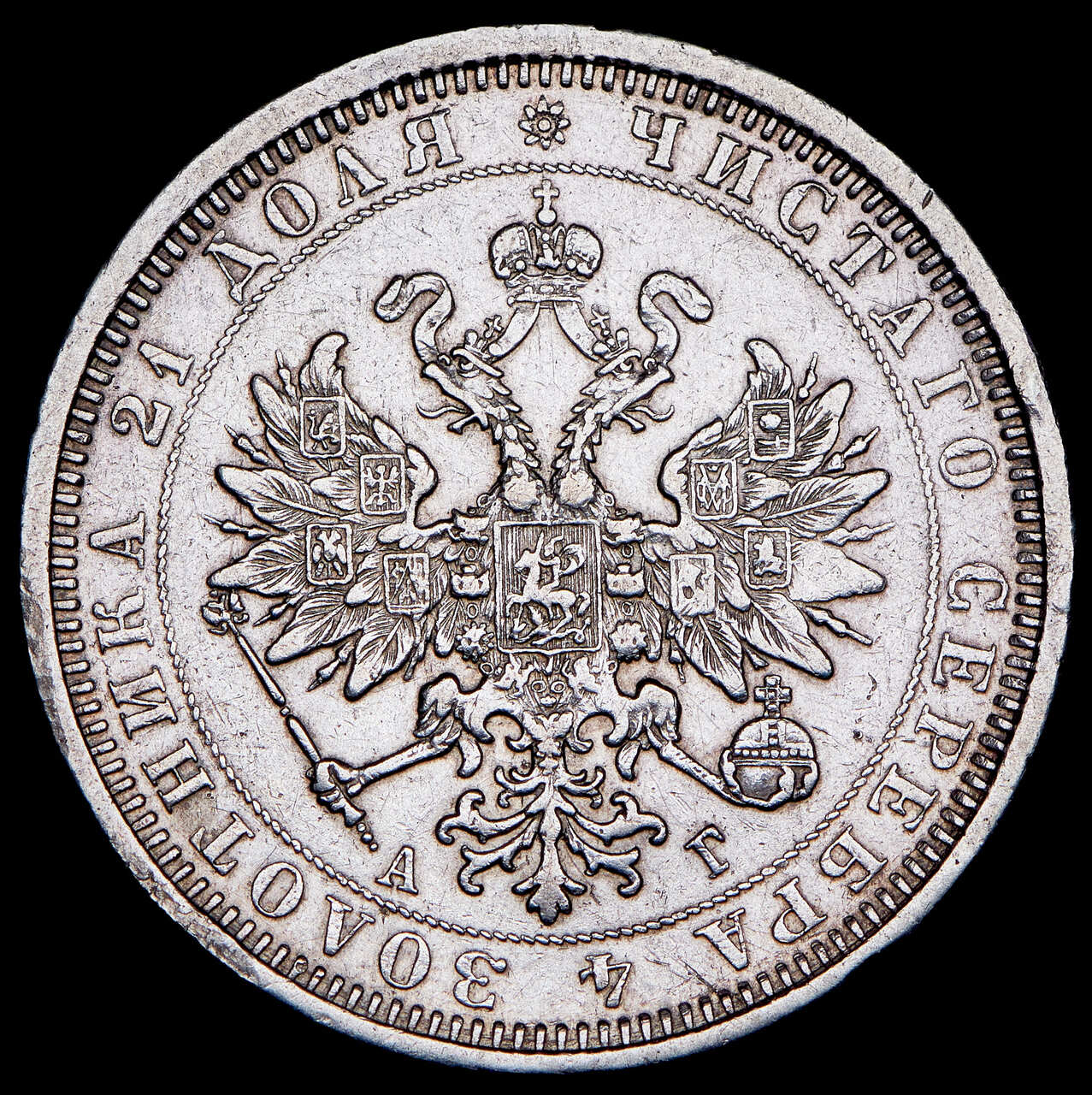 В центре изображен Малый Государственный Герб Российской империи - двуглавый орёл, головы которого увенчаны двумя коронами, третья, большая корона над ними. Все они соединены орденской лентой ордена Св. Апостола Андрея Первозванного. На груди орла расположен Московский герб, в щите изображен Георгий Победоносец с копьем поражающий дракона. Вокруг щита цепь ордена Св. Апостола Андрея Первозванного. На крыльях изображены гербы: Царства Казанского, Польского, Херсонеса Таврического, Астраханского, Сибирского, Грузинского и герб соединенных княжеств Киевского, Новгородского и Владимирского — по 4 на каждое крыло. В правой лапе орла – скипетр, в левой – держава. Под правой лапой – буква «А», под левой – буква «Г». Инициалы минцмейстера Аполлона Грасгофа. Центральная часть отделена от остального изображения, окружностью в виде точек. За окружностью круговая надпись: «ЧИСТАГО СЕРЕБРА 4 ЗОЛОТНИКА 21 ДОЛЯ», разделенная сверху цветочной розеткой. По окружности канта имеются рельефные элементы, выполненные в виде зубцов.