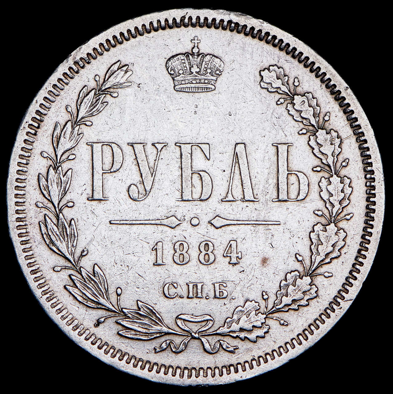 В центре указан номинал «РУБЛЬ». Над номиналом – Корона Российской империи. Под номиналом расположен декоративный разделитель в виде двух разнонаправленных фигурных линий и небольшой выпуклой точки между ними. Под разделителем — дата выпуска монеты «1884». Под цифрой даты — обозначение монетного двора «С.П.Б.». Вдоль канта, не доходя до короны, изображен венок из лавровой и дубовой ветви, которые в нижней части перевязаны лентой на узел бантом. По окружности канта имеются рельефные элементы, выполненные в виде зубцов.