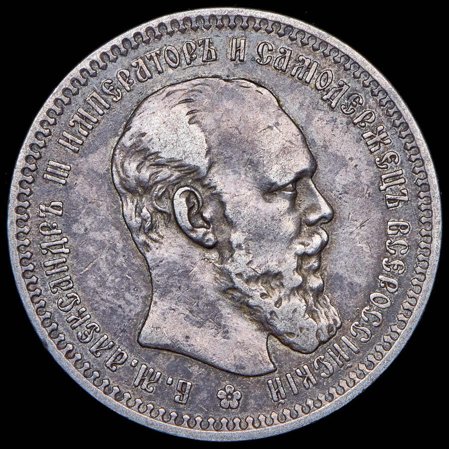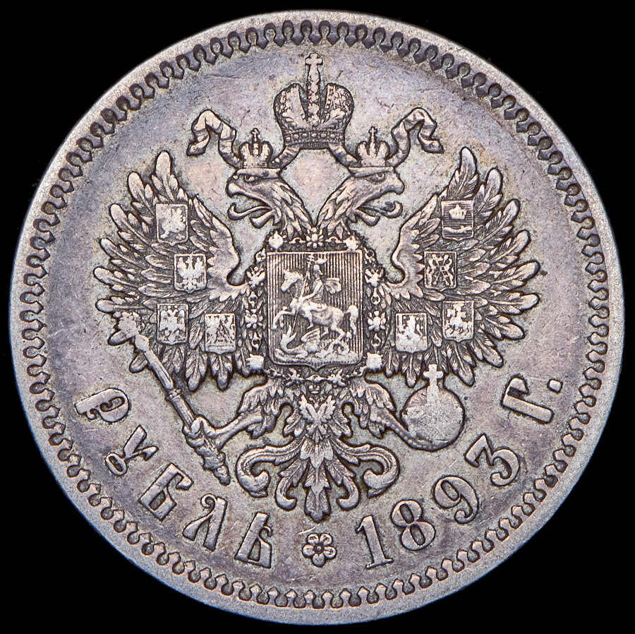 В центре изображен Малый Государственный Герб Российской империи - двуглавый орёл, головы которого увенчаны двумя коронами, третья, большая корона над ними. Все они соединены орденской лентой ордена Св. Апостола Андрея Первозванного. На груди орла расположен Московский герб, в щите изображен Георгий Победоносец с копьем поражающий дракона. Вокруг щита цепь ордена Св. Апостола Андрея Первозванного. На крыльях изображены гербы: Царства Казанского, Польского, Херсонеса Таврического, Астраханского, Сибирского, Грузинского и герб соединенных княжеств Киевского, Новгородского и Владимирского — по 4 на каждое крыло. В правой лапе орла – скипетр, в левой – держава. Под ним слева направо изображены: номинал - надпись «РУБЛЬ», цветочная розетка и дата выпуска «1893 Г.». По окружности канта имеются рельефные элементы, выполненные в виде зубцов.