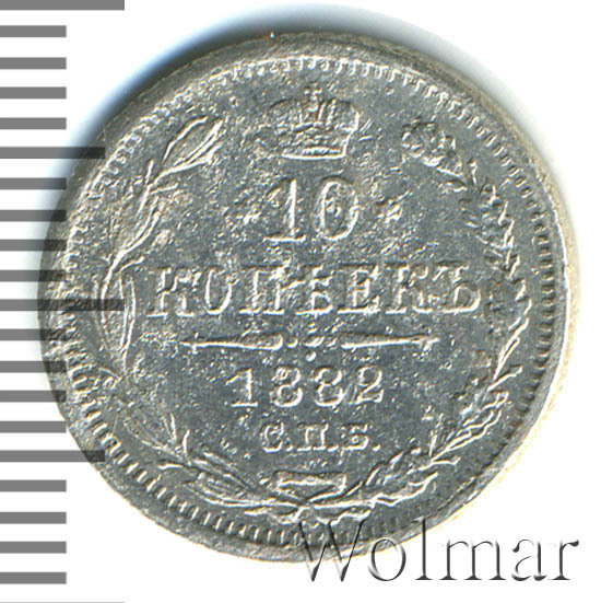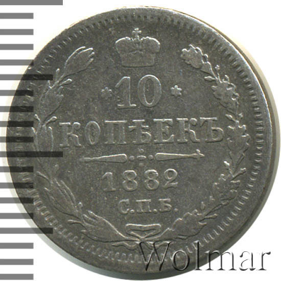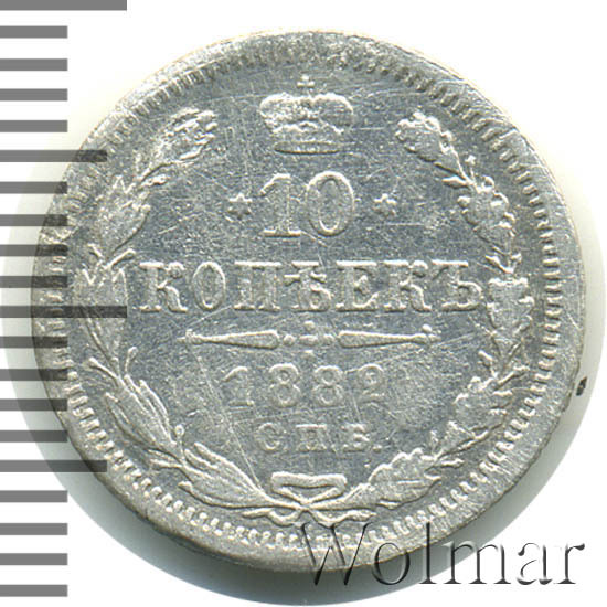 В центре указан номинал «10», ограниченный с обеих сторон шестиконечными звездочками. Над цифрой – Корона Российской империи. Под цифрой номинала — слово "КОПЕЕК". Ниже, расположен декоративный разделитель в виде двух разнонаправленных фигурных линий и стилизованным из точек крестом между ними. Под разделителем — дата выпуска монеты «1882». Под цифрой даты — обозначение монетного двора «С.П.Б.». Вдоль канта, не доходя до короны, изображен венок из лавровой и дубовой ветви, которые в нижней части перевязаны лентой на узел бантом. По окружности канта имеются рельефные элементы, выполненные в виде зубцов.