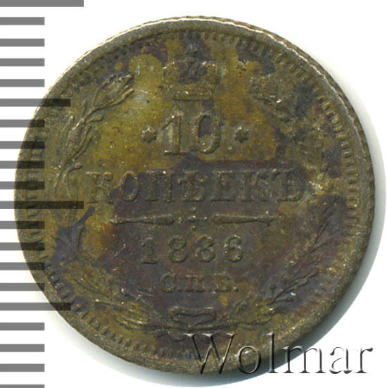 В центре указан номинал «10», ограниченный с обеих сторон шестиконечными звездочками. Над цифрой – Корона Российской империи. Под цифрой номинала — слово "КОПЕЕК". Ниже, расположен декоративный разделитель в виде двух разнонаправленных фигурных линий и стилизованным из точек крестом между ними. Под разделителем — дата выпуска монеты «1886». Под цифрой даты — обозначение монетного двора «С.П.Б.». Вдоль канта, не доходя до короны, изображен венок из лавровой и дубовой ветви, которые в нижней части перевязаны лентой на узел бантом. По окружности канта имеются рельефные элементы, выполненные в виде зубцов.