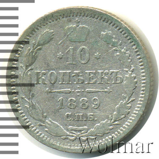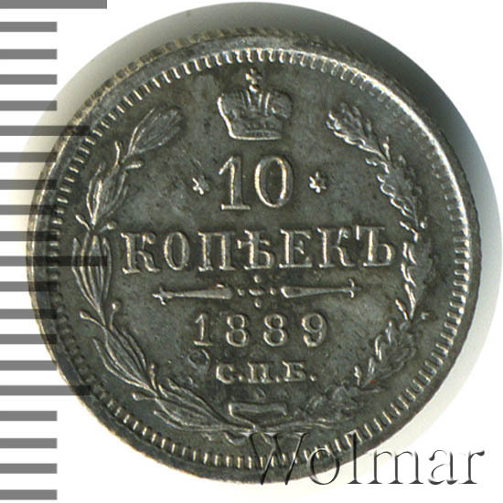 В центре указан номинал «10», ограниченный с обеих сторон шестиконечными звездочками. Над цифрой – Корона Российской империи. Под цифрой номинала — слово "КОПЕЕК". Ниже, расположен декоративный разделитель в виде двух разнонаправленных фигурных линий и стилизованным из точек крестом между ними. Под разделителем — дата выпуска монеты «1889». Под цифрой даты — обозначение монетного двора «С.П.Б.». Вдоль канта, не доходя до короны, изображен венок из лавровой и дубовой ветви, которые в нижней части перевязаны лентой на узел бантом. По окружности канта имеются рельефные элементы, выполненные в виде зубцов.