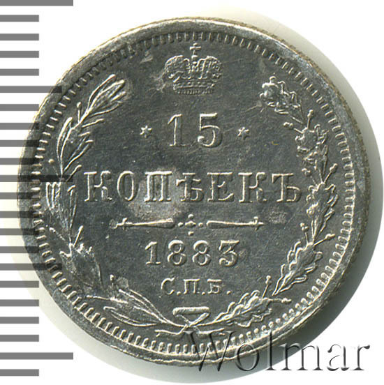 В центре указан номинал «15», ограниченный с обеих сторон шестиконечными звездочками. Над цифрой – Корона Российской империи. Под цифрой номинала — слово "КОПЕЕК". Ниже, расположен декоративный разделитель в виде двух разнонаправленных фигурных линий и стилизованным из точек крестом между ними. Под разделителем — дата выпуска монеты «1883». Под цифрой даты — обозначение монетного двора «С.П.Б.». Вдоль канта, не доходя до короны, изображен венок из лавровой и дубовой ветви, которые в нижней части перевязаны лентой на узел бантом. По окружности канта имеются рельефные элементы, выполненные в виде зубцов.