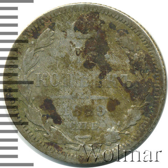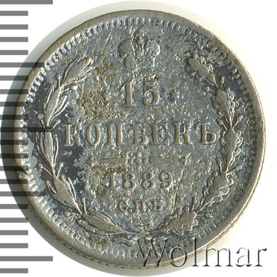 В центре указан номинал «15», ограниченный с обеих сторон шестиконечными звездочками. Над цифрой – Корона Российской империи. Под цифрой номинала — слово "КОПЕЕК". Ниже, расположен декоративный разделитель в виде двух разнонаправленных фигурных линий и стилизованным из точек крестом между ними. Под разделителем — дата выпуска монеты «1889». Под цифрой даты — обозначение монетного двора «С.П.Б.». Вдоль канта, не доходя до короны, изображен венок из лавровой и дубовой ветви, которые в нижней части перевязаны лентой на узел бантом. По окружности канта имеются рельефные элементы, выполненные в виде зубцов.
