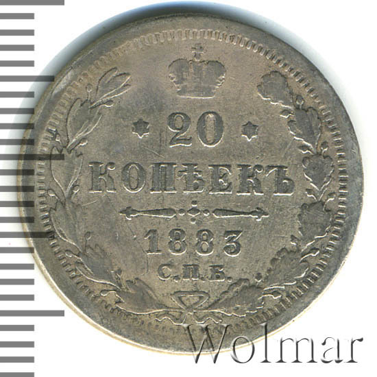 В центре указан номинал «20», ограниченный с обеих сторон шестиконечными звездочками. Над цифрой – Корона Российской империи. Под цифрой номинала — слово "КОПЕЕК". Ниже, расположен декоративный разделитель в виде двух разнонаправленных фигурных линий и стилизованным из точек крестом между ними. Под разделителем — дата выпуска монеты «1883». Под цифрой даты — обозначение монетного двора «С.П.Б.». Вдоль канта, не доходя до короны, изображен венок из лавровой и дубовой ветви, которые в нижней части перевязаны лентой на узел бантом. По окружности канта имеются рельефные элементы, выполненные в виде зубцов.