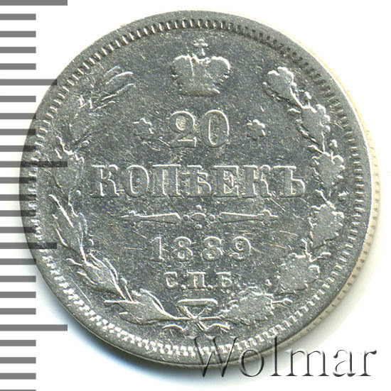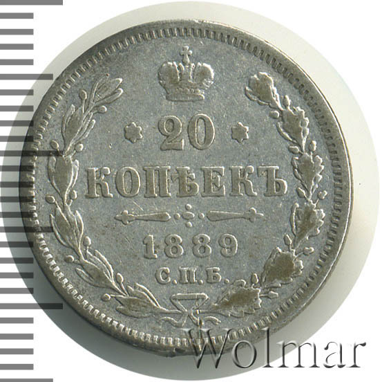 В центре указан номинал «20», ограниченный с обеих сторон шестиконечными звездочками. Над цифрой – Корона Российской империи. Под цифрой номинала — слово "КОПЕЕК". Ниже, расположен декоративный разделитель в виде двух разнонаправленных фигурных линий и стилизованным из точек крестом между ними. Под разделителем — дата выпуска монеты «1889». Под цифрой даты — обозначение монетного двора «С.П.Б.». Вдоль канта, не доходя до короны, изображен венок из лавровой и дубовой ветви, которые в нижней части перевязаны лентой на узел бантом. По окружности канта имеются рельефные элементы, выполненные в виде зубцов.