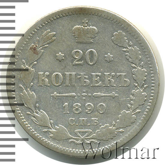 В центре указан номинал «20», ограниченный с обеих сторон шестиконечными звездочками. Над цифрой – Корона Российской империи. Под цифрой номинала — слово "КОПЕЕК". Ниже, расположен декоративный разделитель в виде двух разнонаправленных фигурных линий и стилизованным из точек крестом между ними. Под разделителем — дата выпуска монеты «1890». Под цифрой даты — обозначение монетного двора «С.П.Б.». Вдоль канта, не доходя до короны, изображен венок из лавровой и дубовой ветви, которые в нижней части перевязаны лентой на узел бантом. По окружности канта имеются рельефные элементы, выполненные в виде зубцов.