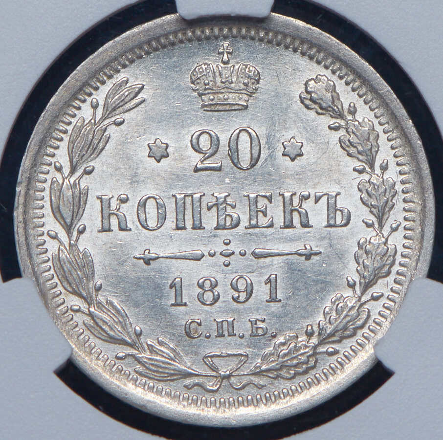 В центре указан номинал «20», ограниченный с обеих сторон шестиконечными звездочками. Над цифрой – Корона Российской империи. Под цифрой номинала — слово "КОПЕЕК". Ниже, расположен декоративный разделитель в виде двух разнонаправленных фигурных линий и стилизованным из точек крестом между ними. Под разделителем — дата выпуска монеты «1891». Под цифрой даты — обозначение монетного двора «С.П.Б.». Вдоль канта, не доходя до короны, изображен венок из лавровой и дубовой ветви, которые в нижней части перевязаны лентой на узел бантом. По окружности канта имеются рельефные элементы, выполненные в виде зубцов.