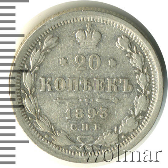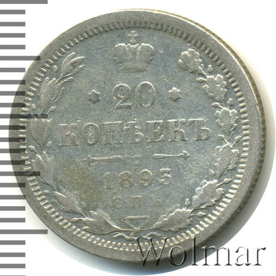 В центре указан номинал «20», ограниченный с обеих сторон шестиконечными звездочками. Над цифрой – Корона Российской империи. Под цифрой номинала — слово "КОПЕЕК". Ниже, расположен декоративный разделитель в виде двух разнонаправленных фигурных линий и стилизованным из точек крестом между ними. Под разделителем — дата выпуска монеты «1893». Под цифрой даты — обозначение монетного двора «С.П.Б.». Вдоль канта, не доходя до короны, изображен венок из лавровой и дубовой ветви, которые в нижней части перевязаны лентой на узел бантом. По окружности канта имеются рельефные элементы, выполненные в виде зубцов.