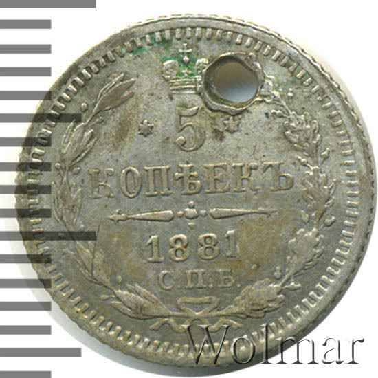 В центре указан номинал «5», ограниченный с обеих сторон шестиконечными звездочками. Над цифрой – Корона Российской империи. Под цифрой номинала — слово "КОПЕЕК". Ниже, расположен декоративный разделитель в виде двух разнонаправленных фигурных линий и стилизованным из точек крестом между ними. Под разделителем — дата выпуска монеты «1881». Под цифрой даты — обозначение монетного двора «С.П.Б.». Вдоль канта, не доходя до короны, изображен венок из лавровой и дубовой ветви, которые в нижней части перевязаны лентой на узел бантом. По окружности канта имеются рельефные элементы, выполненные в виде зубцов.