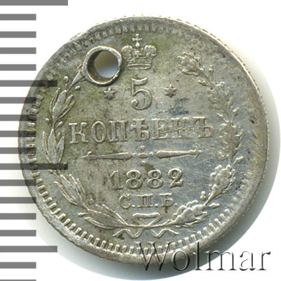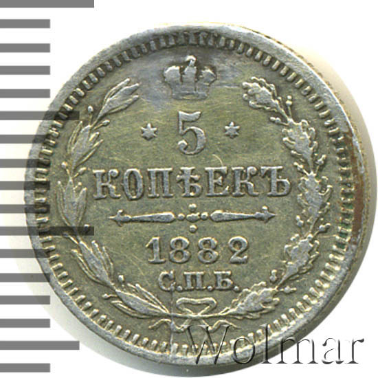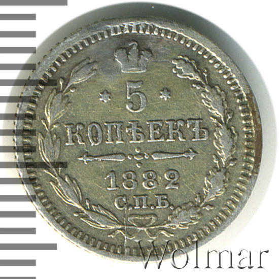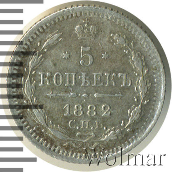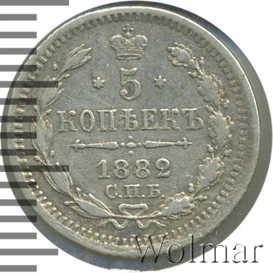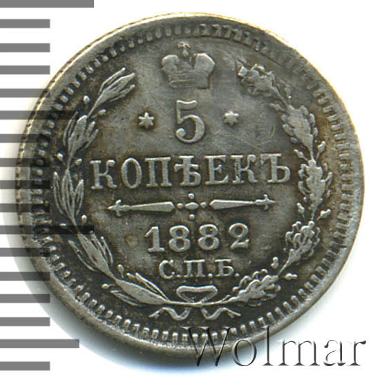 В центре указан номинал «5», ограниченный с обеих сторон шестиконечными звездочками. Над цифрой – Корона Российской империи. Под цифрой номинала — слово "КОПЕЕК". Ниже, расположен декоративный разделитель в виде двух разнонаправленных фигурных линий и стилизованным из точек крестом между ними. Под разделителем — дата выпуска монеты «1882». Под цифрой даты — обозначение монетного двора «С.П.Б.». Вдоль канта, не доходя до короны, изображен венок из лавровой и дубовой ветви, которые в нижней части перевязаны лентой на узел бантом. По окружности канта имеются рельефные элементы, выполненные в виде зубцов.