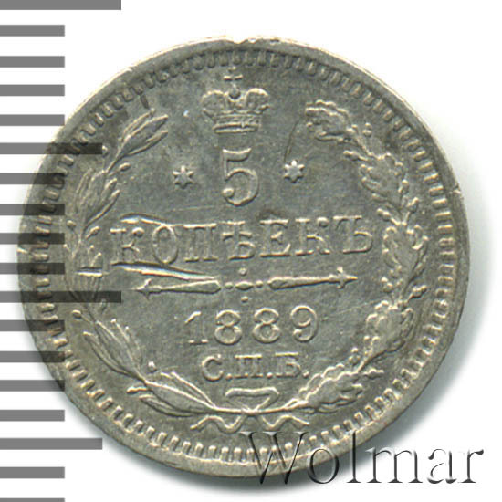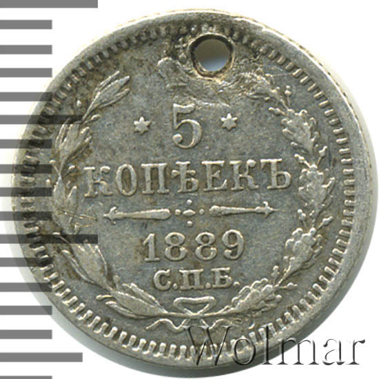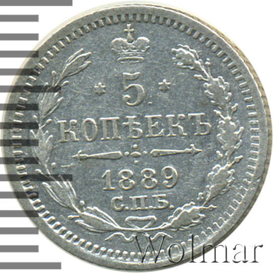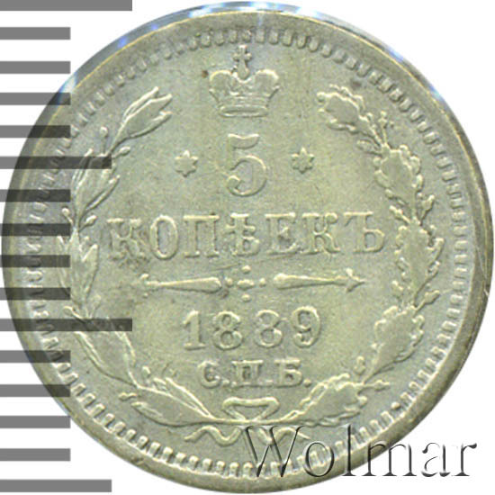 В центре указан номинал «5», ограниченный с обеих сторон шестиконечными звездочками. Над цифрой – Корона Российской империи. Под цифрой номинала — слово "КОПЕЕК". Ниже, расположен декоративный разделитель в виде двух разнонаправленных фигурных линий и стилизованным из точек крестом между ними. Под разделителем — дата выпуска монеты «1889». Под цифрой даты — обозначение монетного двора «С.П.Б.». Вдоль канта, не доходя до короны, изображен венок из лавровой и дубовой ветви, которые в нижней части перевязаны лентой на узел бантом. По окружности канта имеются рельефные элементы, выполненные в виде зубцов.
