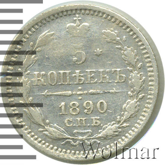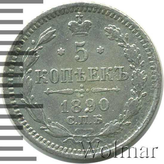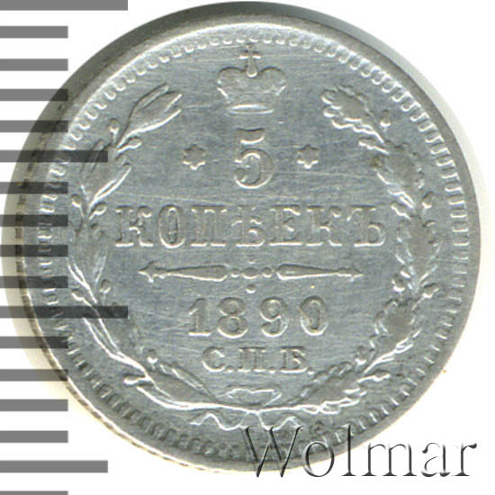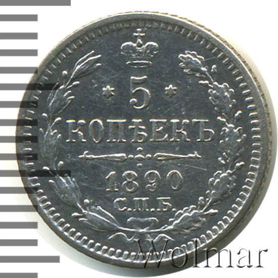 В центре указан номинал «5», ограниченный с обеих сторон шестиконечными звездочками. Над цифрой – Корона Российской империи. Под цифрой номинала — слово "КОПЕЕК". Ниже, расположен декоративный разделитель в виде двух разнонаправленных фигурных линий и стилизованным из точек крестом между ними. Под разделителем — дата выпуска монеты «1890». Под цифрой даты — обозначение монетного двора «С.П.Б.». Вдоль канта, не доходя до короны, изображен венок из лавровой и дубовой ветви, которые в нижней части перевязаны лентой на узел бантом. По окружности канта имеются рельефные элементы, выполненные в виде зубцов.