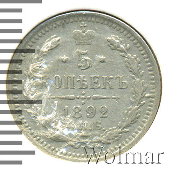 В центре указан номинал «5», ограниченный с обеих сторон шестиконечными звездочками. Над цифрой – Корона Российской империи. Под цифрой номинала — слово "КОПЕЕК". Ниже, расположен декоративный разделитель в виде двух разнонаправленных фигурных линий и стилизованным из точек крестом между ними. Под разделителем — дата выпуска монеты «1892». Под цифрой даты — обозначение монетного двора «С.П.Б.». Вдоль канта, не доходя до короны, изображен венок из лавровой и дубовой ветви, которые в нижней части перевязаны лентой на узел бантом. По окружности канта имеются рельефные элементы, выполненные в виде зубцов.