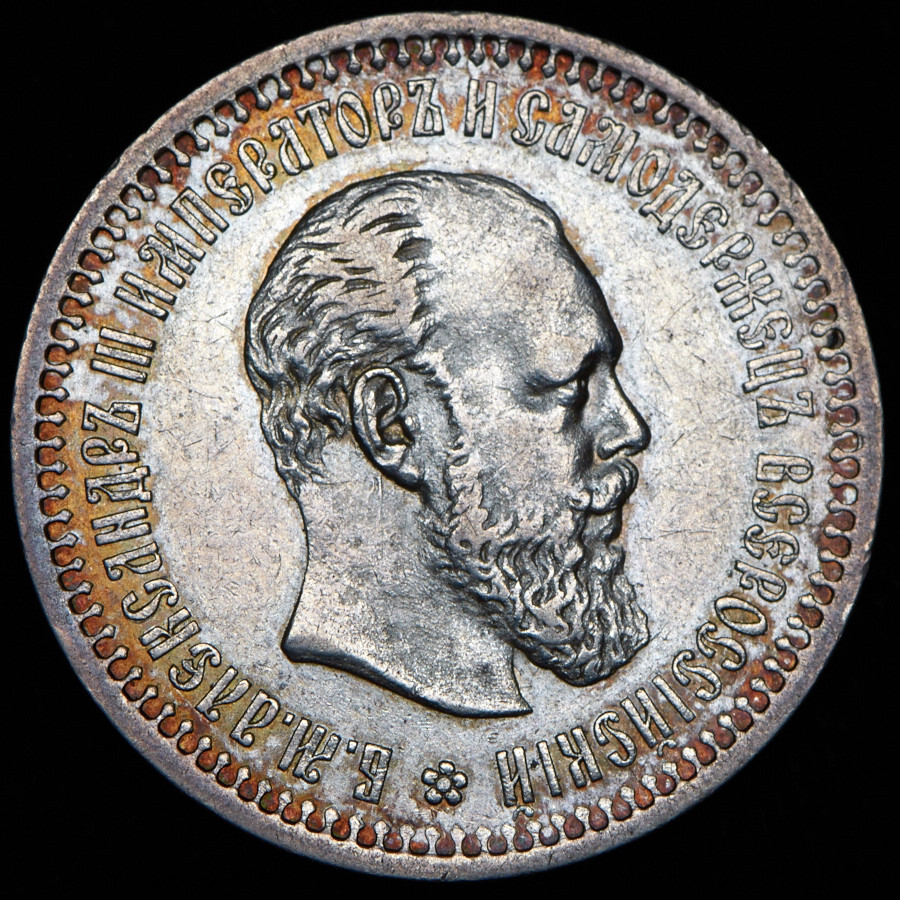 В центре профильный портрет вправо императора Александра III. Вокруг портрета надпись: «Б.М. АЛЕКСАНДРЪ III ИМПЕРАТОРЪ И САМОДЕРЖЕЦЪ ВСЕРОССIЙСКIЙ», разделенная внизу, под обрезом шеи, цветочной розеткой. По окружности канта имеются рельефные элементы, выполненные в виде зубцов.