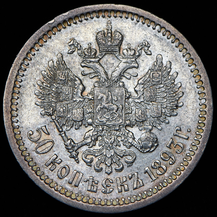 В центре изображен Малый Государственный Герб Российской империи - двуглавый орёл, головы которого увенчаны двумя коронами, третья, большая корона над ними. Все они соединены орденской лентой ордена Св. Апостола Андрея Первозванного. На груди орла расположен Московский герб, в щите изображен Георгий Победоносец с копьем поражающий дракона. Вокруг щита цепь ордена Св. Апостола Андрея Первозванного. На крыльях изображены гербы: Царства Казанского, Польского, Херсонеса Таврического, Астраханского, Сибирского, Грузинского и герб соединенных княжеств Киевского, Новгородского и Владимирского — по 4 на каждое крыло. В правой лапе орла – скипетр, в левой – держава. Под ним слева направо изображены: номинал - надпись «50 копеек» и дата выпуска «1893 Г.». По окружности канта имеются рельефные элементы, выполненные в виде зубцов.