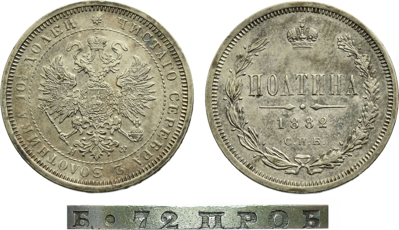 Полтина 1882 года, СПБ-НФ. Гурт: … СЕБЕБ . 72 ПРОБЫ … Серебро, 10,38 г. Сохранность почти отличная. ГМ# нет. Severin# 3922 (черта с точкой). Уздеников# 1966 (черта с точкой). Биткин# 49 ( R2 ). Очень редкая, 25 рублей по Ильину. Отсутствовала в коллекции Великого Князя Георгия Михайловича.