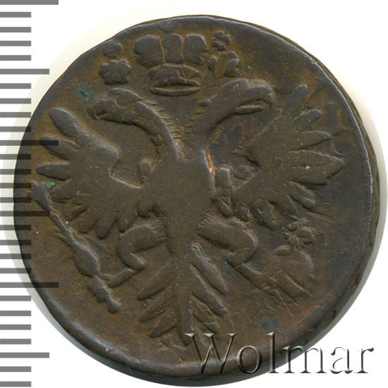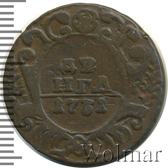 В центре изображён картуш украшенный виньетками, по обеим сторонам две лавровые ветви, сверху - цветочная розетка. Под картушем - две перекрещенные пальмовые ветви с обвязкой (бантом). В картуше надпись в три строки, в которой указан номинал и год выпуска: «ДЕ»│«НГА»│«1731».