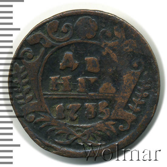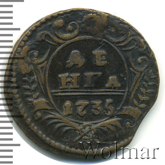 В этот год было выпущено пять номиналов монет (от полушки до рубля). Денга 1735 года производилась из меди. Тираж доподлинно не известен. Соостность (расположение аверса к реверсу) – 0 градусов (медальная). Монетная стопа – десять рублей из пуда. Имеет множество разновидностей по деталям изображения на монете (по форме цветка и числу лепестков, размеру короны, количеству перьев на крыльях, деталям голов и хвоста имперского орла, по боковым и нижним ветвям и т.д.). Цена денги 1735 года не высока, для экземпляров в "кабинетной" сохранности (без следов пребывания в земле), возрастает в десятки раз. Более подробно ознакомиться с ценой денги 1735 года, Вы можете во вкладке «стоимость монеты», а так же принять участие в текущих аукционах, пройдя по вкладке «активные лоты».