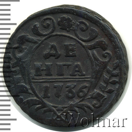 В центре изображён картуш украшенный виньетками, по обеим сторонам две лавровые ветви, сверху - цветочная розетка. Под картушем - две перекрещенные пальмовые ветви с обвязкой (бантом). В картуше надпись в три строки, в которой указан номинал и год выпуска: «ДЕ»│«НГА»│«1736». Между номиналом и годом выпуска две прямые черты.