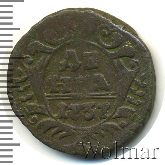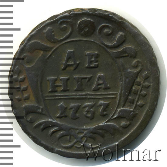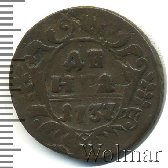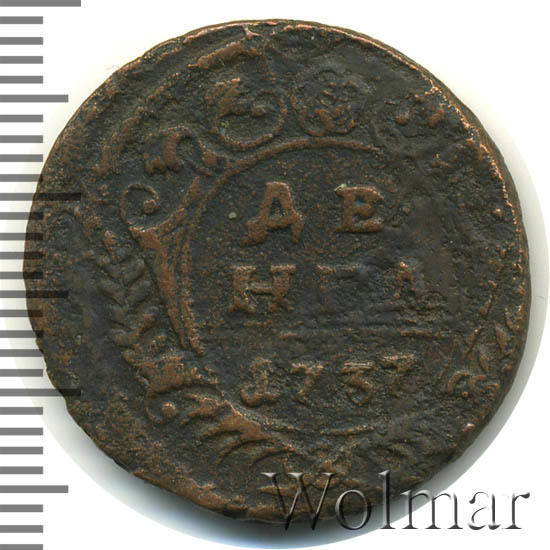 Медная монета достоинством денга, датированная 1737 годом, отчеканена на двух монетных дворах: Московском (Красный) и Екатеринбургском, в годы правления императрицы Анны Иоанновны, племянницы Петра I. В этот год было выпущено всего четыре номинала монет (от полушки до рубля) для денежного обращения Российской империи.