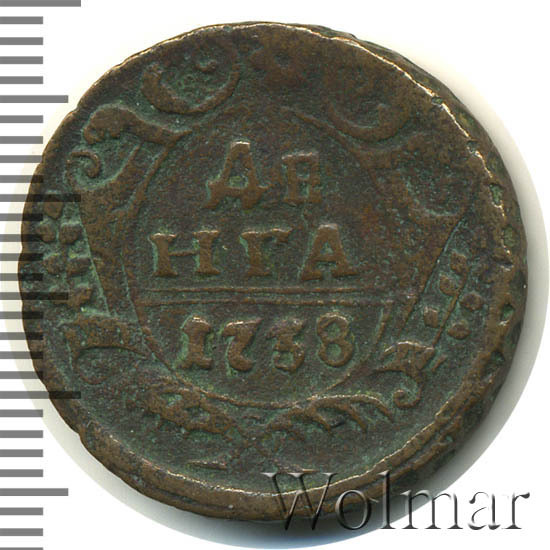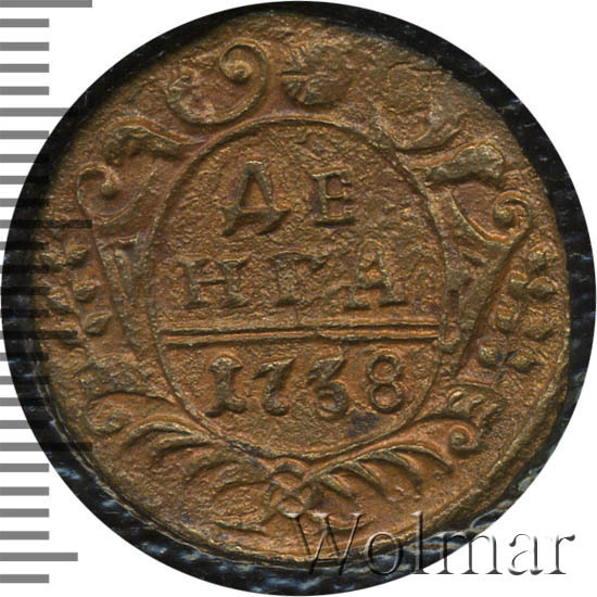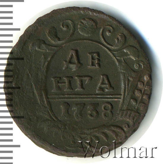 При Анне Иоановне медная денга 1738 года, весившая вдвое больше чем полушка, самый маленький номинал царской разменной монеты, чеканилась на Екатеринбургском и Московском (Красном и Кадышевском) монетных дворах без буквенного обозначения на самих монетах. Известна более редкая разновидность денги с маленькой короной, венчающей орла на лицевой стороне. Внушительная часть подобных монет была изготовлена путём перечеканки легковесных петровских копеек 1704 - 1718 годов. Коллекционеры различают множество разновидностей по таким деталям рисунка, как цифры даты и обозначение номинала, не большие различия в гербовом орле, считается что вполне возможны находки неизвестных монет с новым сочетанием аверса и реверса. Гурт у денги покрыт сетчатым узором.