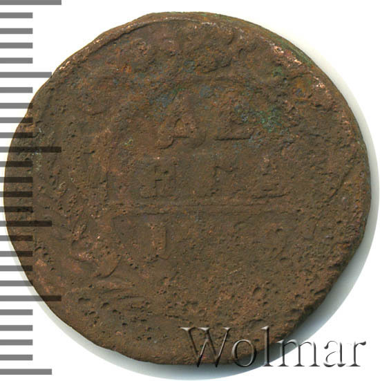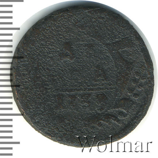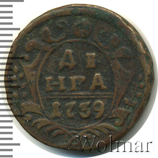 В центре изображён картуш украшенный виньетками, по обеим сторонам две лавровые ветви, сверху - цветочная розетка. Под картушем - две перекрещенные пальмовые ветви с обвязкой (бантом). В картуше надпись в три строки, в которой указан номинал и год выпуска: «ДЕ»│«НГА»│«1739». Между номиналом и годом выпуска две прямые черты.