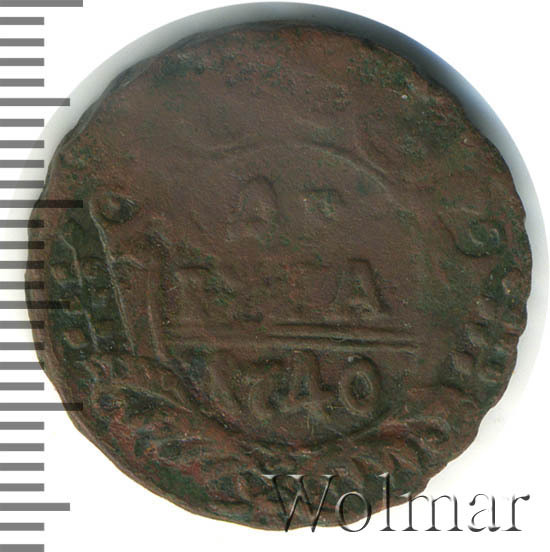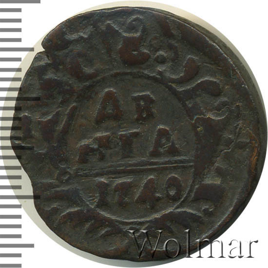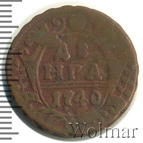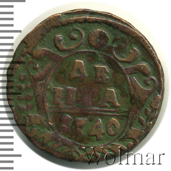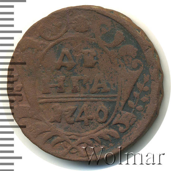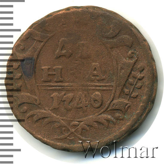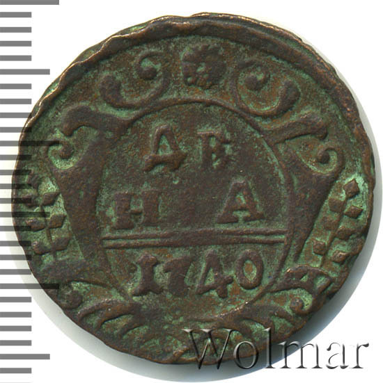 Производство денги (равной двум полушкам или одной двухсотой части рубля) в 1740 году велось на Екатеринбургском монетном дворе из расчёта 10 рублей из пуда (16380 гр.) меди. Последний год правления императрицы Анны Иоанновны (1730 – 1740 гг.). В этот год было выпущено в денежное обращение Российской империи всего пять номиналов: два чеканили из меди (полушка , денга), три из серебра (полуполтинник , полтина, рубль).