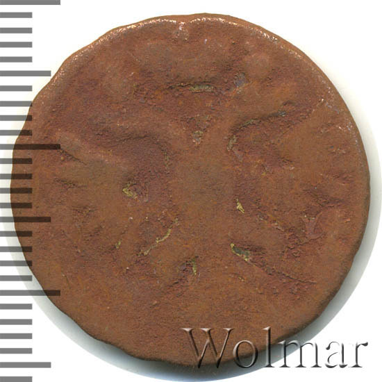 В центре изображён картуш украшенный виньетками, по обеим сторонам две лавровые ветви, сверху - цветочная розетка. Под картушем - две перекрещенные пальмовые ветви с обвязкой (бантом). В картуше надпись в три строки, в которой указан номинал и год выпуска: «ДЕ»│«НГА»│«1740». Между номиналом и годом выпуска две прямые черты.