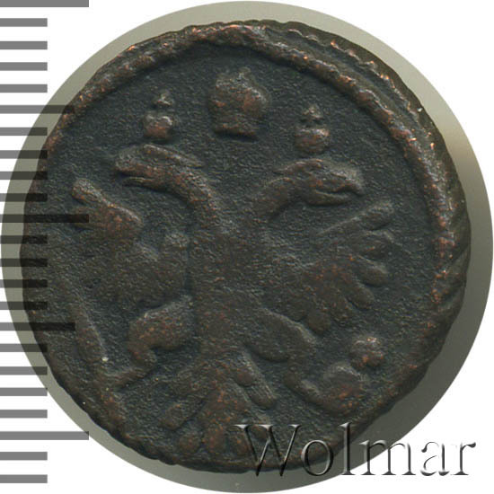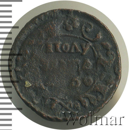В центре изображён картуш украшенный виньетками, по обеим сторонам две лавровые ветви, сверху - цветочная розетка. Под картушем - две перекрещенные пальмовые ветви с обвязкой (бантом). В картуше надпись в три строки, в которой указан номинал и год выпуска: «ПОЛУ»│«ШКА»│«1730».