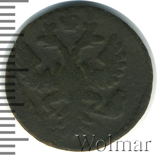 В центре изображён картуш украшенный виньетками, по обеим сторонам две лавровые ветви, сверху - цветочная розетка. Под картушем - две перекрещенные пальмовые ветви с обвязкой (бантом). В картуше надпись в три строки, в которой указан номинал и год выпуска: «ПОЛУ»│«ШКА»│«1731».