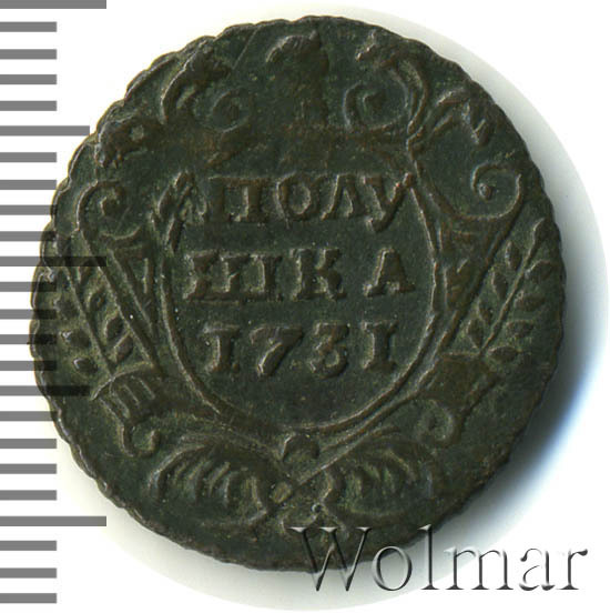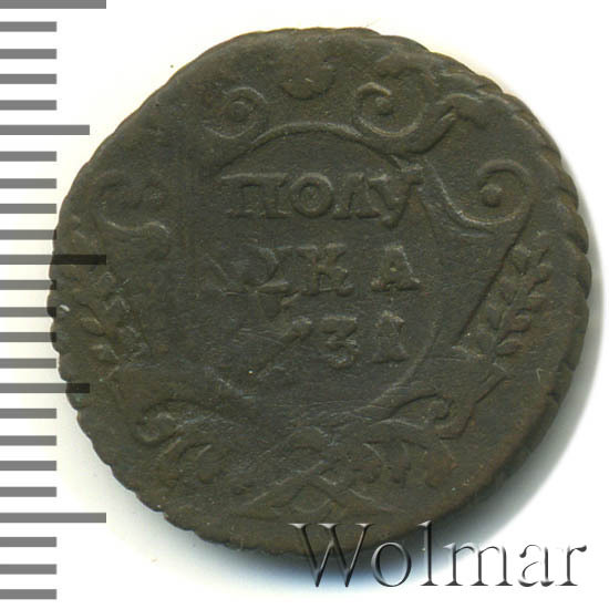 Медные монеты, в период правления императрицы Анны Иоанновны, производились на Красном монетном дворе, который располагался в городе Москве. В тридцать первом году восемнадцатого века, шла массовая перечеканка «старой» монеты, выпущенной в денежный оборот предшественниками взошедшей на российский престол царицы, на новую. Полушки Анны, чеканились по стопе – 10 рублей из пуда меди, перечеканка этой монеты велась из крестовых копеек Петра Второго, выпущенных в 1728 – 29 гг. (мон. стопа 40 руб. из пуда). Множество монеток, сохранила на себе остатки от крестовых копеек (см. фото). Монеты, для перечеканки, на монетный двор приходило огромное количество и иногда, по недосмотру мастера, чеканка полушки 1731 велась на копейке Петра Первого, по массе подходившей для чеканки денги нового образца. Такая перепутка является очень редкой.