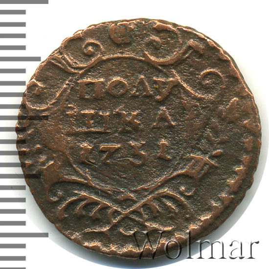 Имеет две основных разновидности – по гурту. Полушка с узорчатым гуртом в пять раз дороже, чем со шнуровидным. Цена полушки 1731 г. не высока, в отличном, не земляном, состоянии, стоимость может возрасти в десятки раз. Подробнее ознакомиться с ценой полушки 1731 года, Вы можете во вкладке "стоимость монеты", так же Вы сможете принять участие в текущих нумизматических аукционах, во вкладке "активные лоты".
